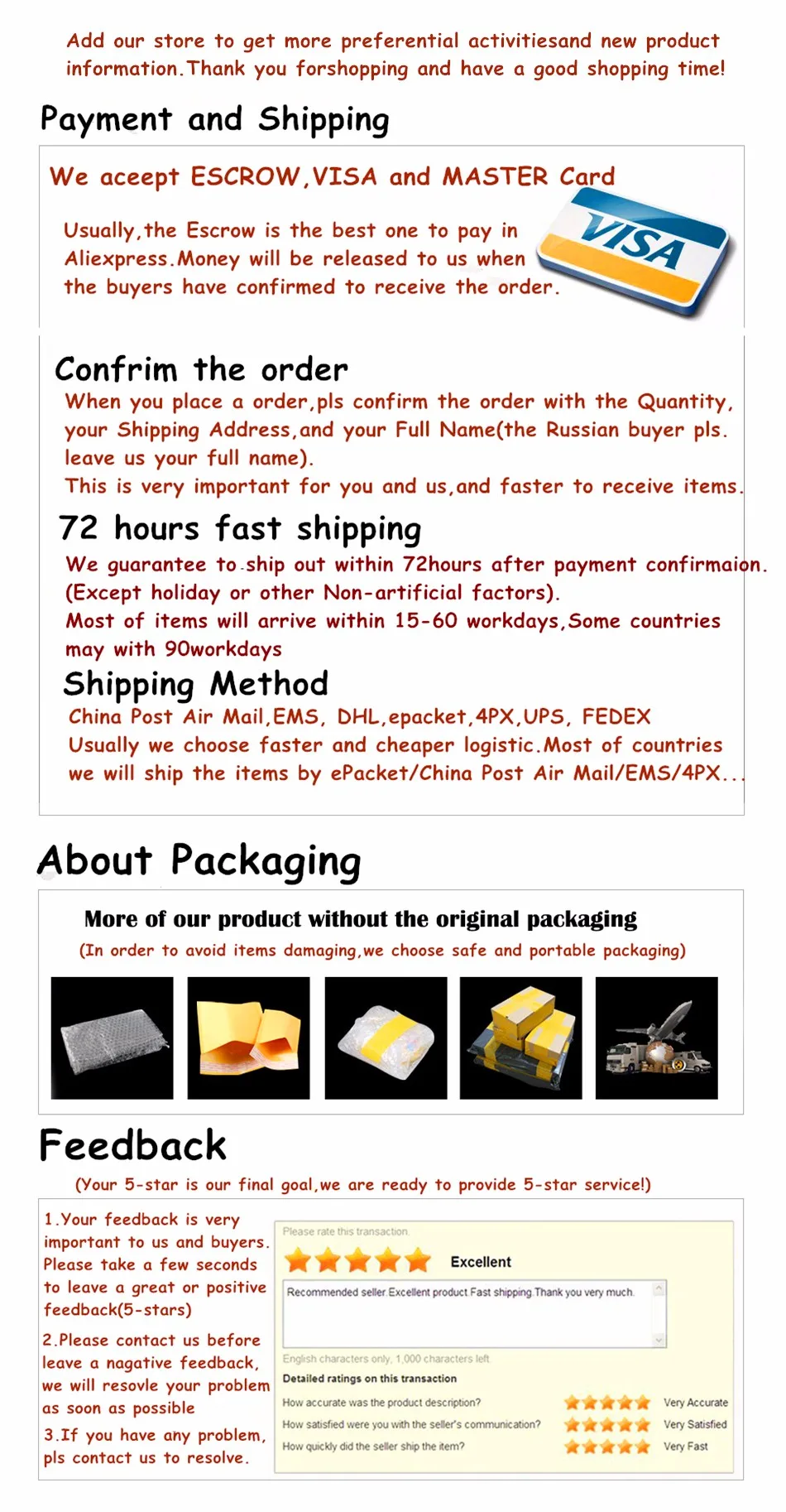 Shipping:China Post Registered Air Mail and Aliexpress standrad shipping to most of countries.ePacket just ship to US.